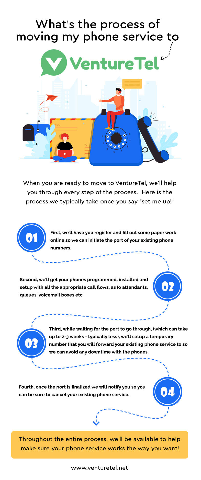 When you are ready to move to VentureTel, we’ll help you through every step of the process. Here is the process we typically take once you say “set me up!"